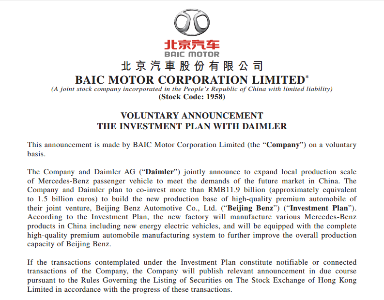 On February 23, 2018, BAIC Motor Corporation Limited (BAIC MOTOR) and Daimler AG jointly announced to invest over RMB 11.9 billion (about 1.5 billion euros) to upgrade the factory of Beijing Branch of BAIC MOTOR in Shunyi District of Beijing, building a new luxury car manufacturing base for Beijing Benz Automotive Co., Ltd. (Beijing Benz).