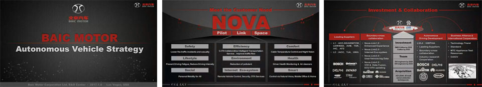 At CES 2017, BAIC not only forged a strategic partnership with Baidu, but also promoted its collaboration with other leading suppliers. BAIC is promoting the collaboration with Bosch in basic devices for autonomous driving and safety driving assist, such as millimeter-wave radar and laser radar, as well as other industrially leading technologies. Also, BAIC will work with Toshiba and LG to upgrade its new-generation intelligent cabin system with its large-size color-screen dashboard, HUD and intelligent rearview mirror.